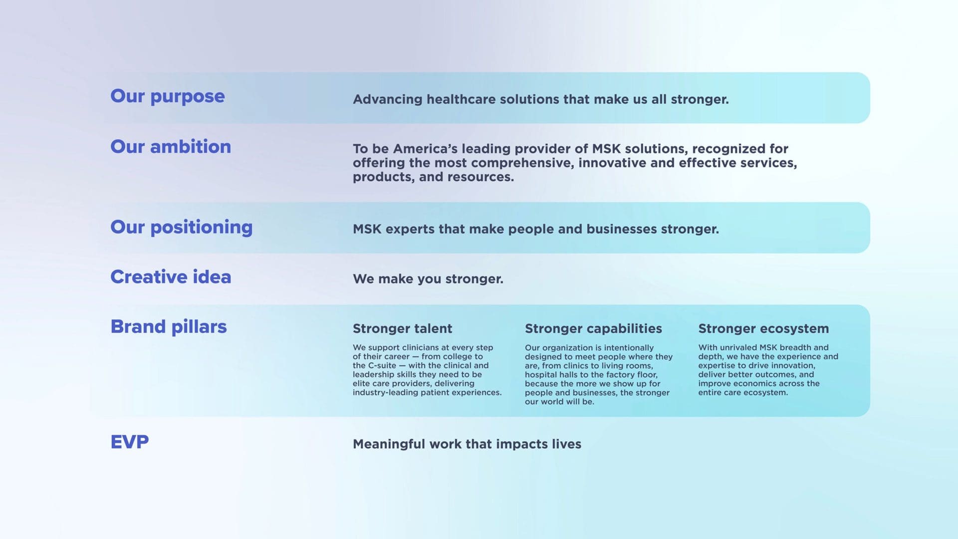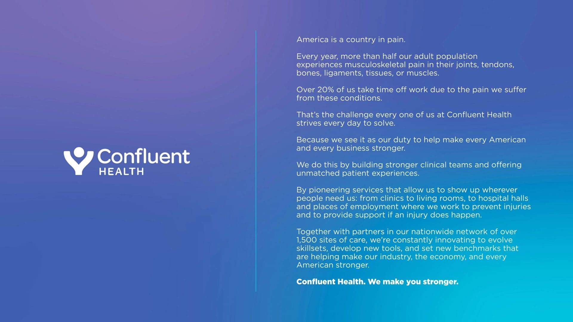 ‘We make you stronger’ grew out of a strategic insight that revolved around the scale of the problem that Confluent Health is built to address. America has a shockingly large pain problem. Every year, over 50% of the population experiences musculoskeletal (MSK) pain. And more than 20% of employees take time off work due to MSK issues.