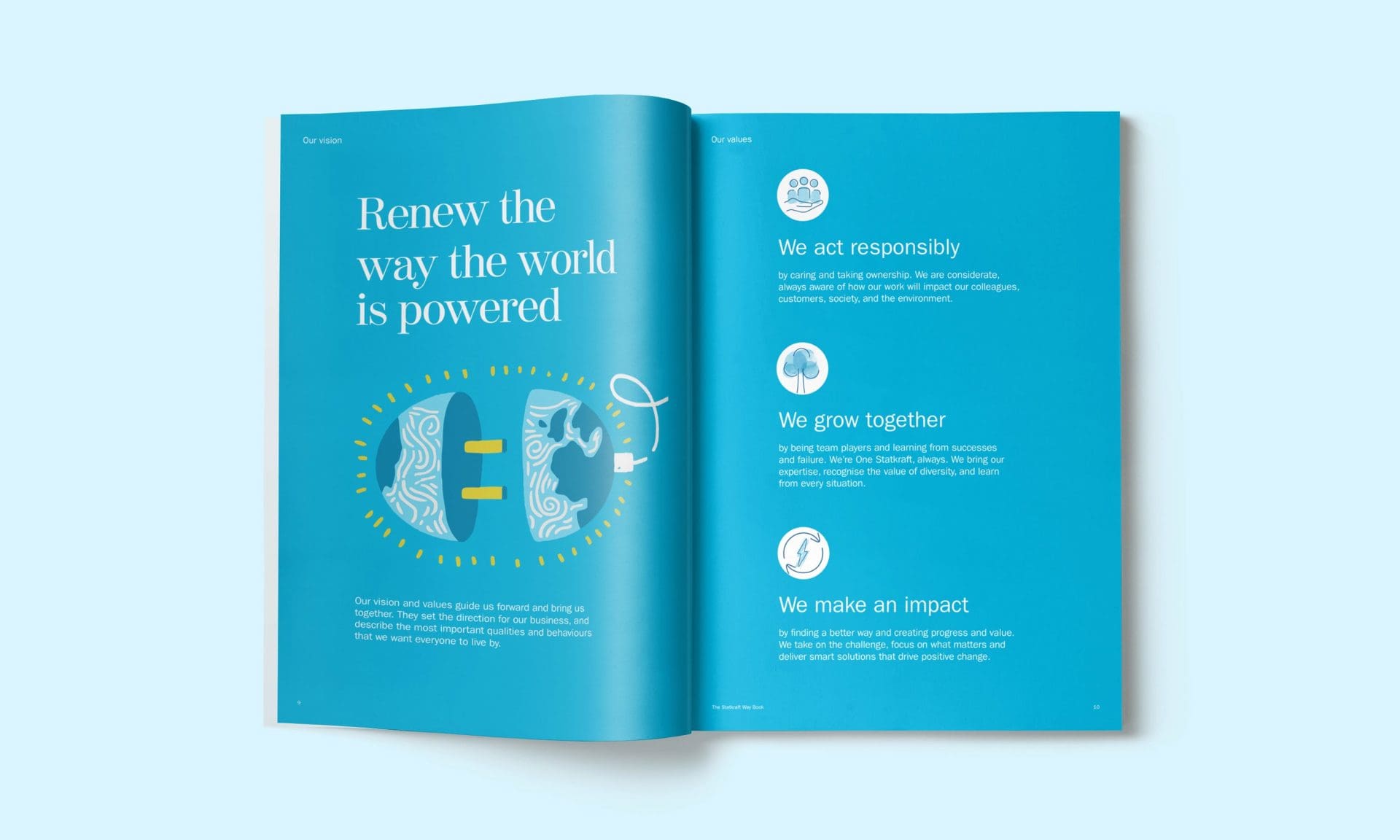 From there, we have worked with Statkraft to operationalize this thinking. In 2023, we collaborated with Statkraft’s governance team to produce ‘The Statkraft Way’ book — introducing the history, future strategy, ways of working, and organizational structure for the business, all told through the lens of the new vision and values.